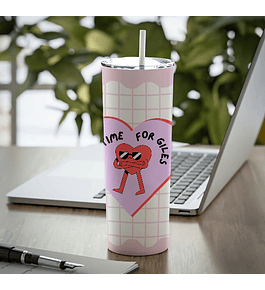 Vaso largo cilíndrico de doble capa de acero inoxidable. Incluye una bombilla de metal para líquidos fríos y calientes. Ilustración hecha a mano en Chile